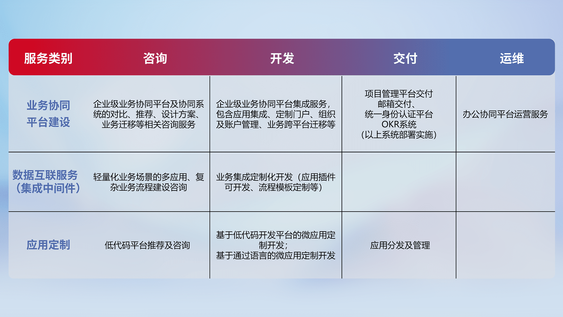 针对钉钉、、、、企微、、IDaas等平台级产品提供产品的规划、、、方案、、、交付、、、、定制化开发等服务,,,,实现如统一协同办公、、、、智能客户服务、、混合会议管理、、、、智能数据查询、、等业务场景,,,,实现数字化转型。。